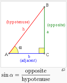 一个角,如上图中的 (读作alpha)的sin值,就是它的对边长度除以斜边长度。即a/h。